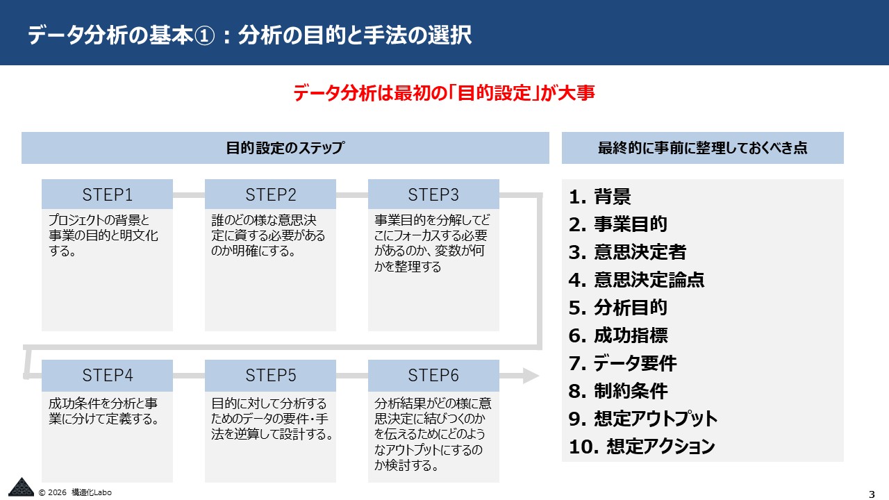 ③分析の成否は手法選定より前、最初の目的設定でほぼ決まる。